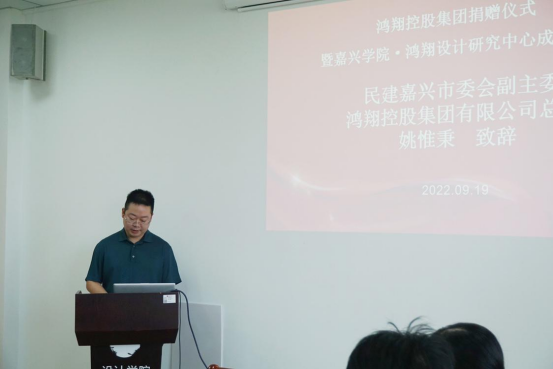 姚惟秉总裁介绍了鸿翔集团的发展历程、产业分布等情况,他指出科技创新是一家企业提升未来核心竞争力以及可持续高质量发展的前提,嘉兴学院作为南湖畔的本土高校,有多个国家级、省级平台,有独特的教育资源优势,为社会源源不断地输送青春创新力量,今天嘉兴学院·鸿翔设计研究中心的揭牌,将进一步深化产教融合,促进教育链人才链与产业链创新链的有机衔接,实现产学协同发展。他表示教育关系到经济建设的未来,支持教育事业就是支持地方经济的发展,今天的教育捐赠,希望能给大家带来精神上的鼓励,为嘉兴学院建设有特色、善创新的一流应用型综合性大学增色添彩。
