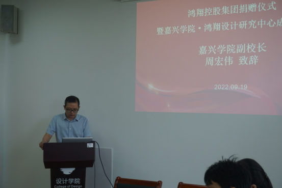 周宏伟副校长向嘉兴学院·鸿翔设计研究中心的成立表示祝贺,对鸿翔控股集团对嘉兴学院发展做出的支持表示感谢。他指出,鸿翔集团的慷慨捐赠不但在物质上为学校的发展添砖加瓦,也在精神上鼓舞学校师生向上向善,这必将更好的推动学校教育事业的发展。嘉兴学院·鸿翔设计研究中心的成立必将深入推进学校人才培育链与地方优势产业链的充分对接,促进学校相关学科建设发展;同时,对嘉兴学院设计资源与相关制造业深度融合,对嘉兴城市建设,也将起到积极的促进作用。