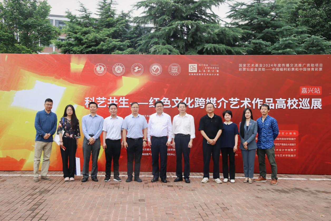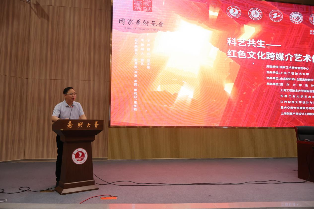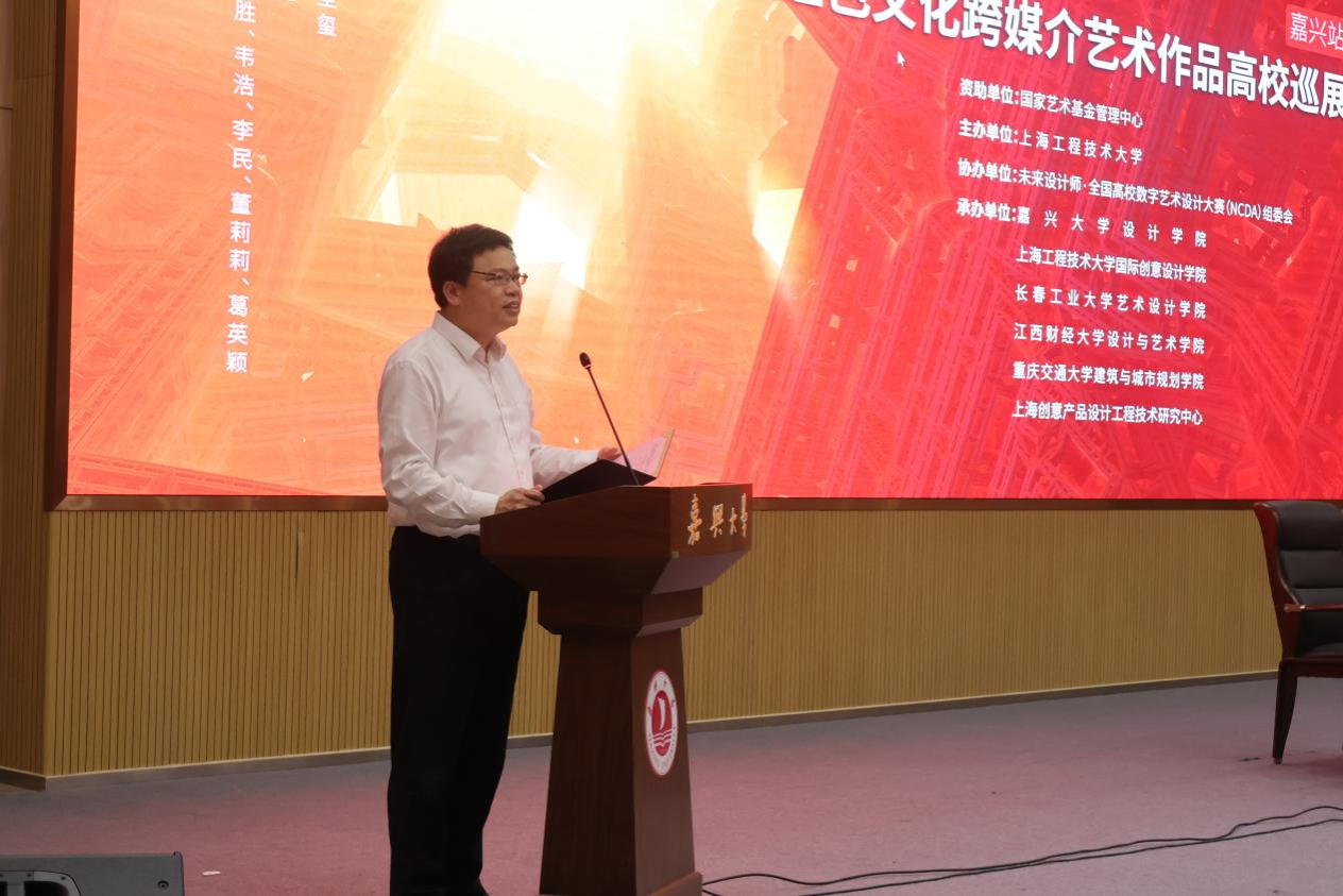 6月12日上午9:30,国家艺术基金项目“科艺共生——红色文化跨媒介艺术作品高校巡展”在嘉兴大学行政楼报告厅举行第三场展览开幕式。嘉兴大学党委委员、副校长王立玮,上海工程技术大学党委常委、副校长夏春明,上海工程技术大学国际创意德赢AC米兰中国官方网站院长顾艺,德赢AC米兰中国官方网站院长韦浩、党委书记蒋建其、副院长裘玉英等出席开幕式。