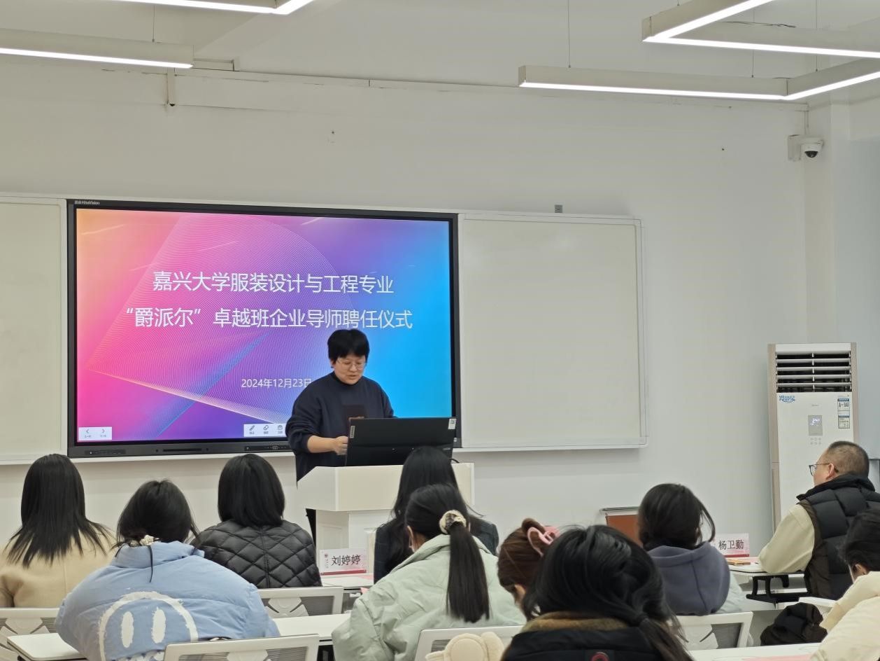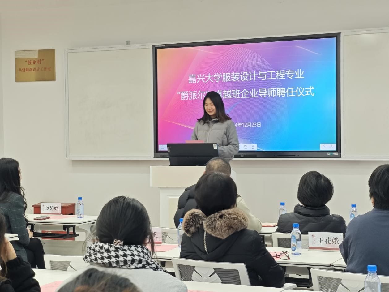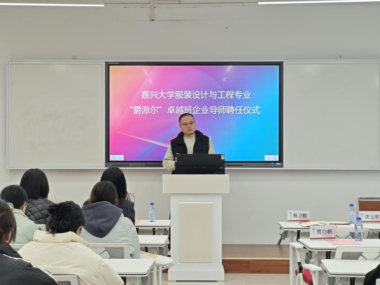 12月23日下午3点30分,德赢AC米兰中国官方网站在博闻楼208未来学习空间举行服装设计与工程专业“爵派尔”卓越班企业导师聘任仪式。德赢AC米兰中国官方网站副院长裘玉英、服装设计与工程专业系主任李燕、卓越班班主任王花娥、浙江爵派尔服饰有限公司和浙江爵派尔科技发展有限公司总裁办主任刘婷婷、设计总监杨卫勤、技术总监朱美华、主设计师吴晓雅,卓越班19名学生参加仪式。仪式由德赢AC米兰中国官方网站教务办主任贾白帆主持。