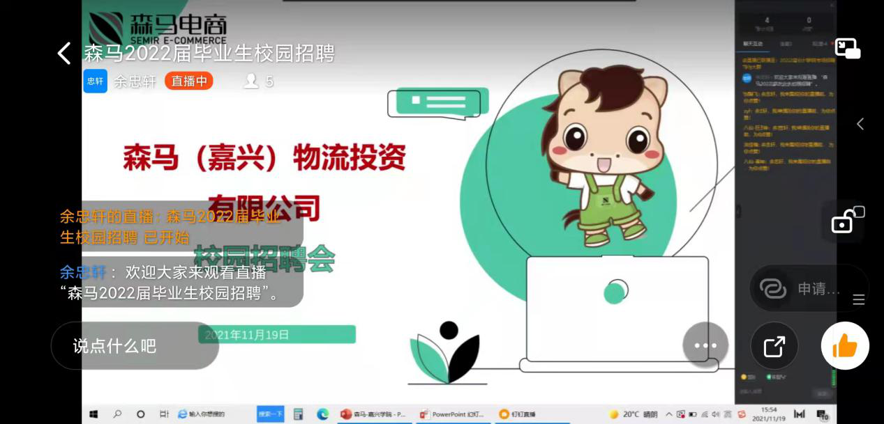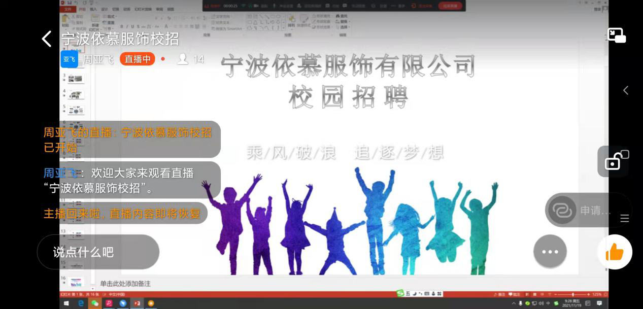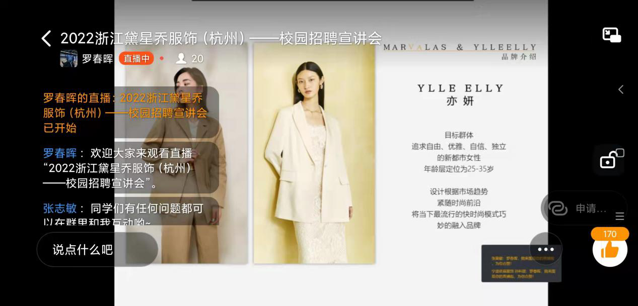 同学们一致认为:“参加线上招聘会,节约不少时间,而且企业类型多样,提供的岗位也多样,对学生来说选择余地更大。” 嘉欣丝绸有限公司招聘负责人邓总对本次招聘会的举办效果表示满意:“我司当天直播效果显著,最多在线观看人数45人,共收到有效投递简历5份。” 浙江辉吉青服饰(集团)有限公司人力资源经理胡总表示在招聘会前公司邮箱就已收到一位同学的求职简历,直播宣讲当天和这位同学经线上深入沟通,双方达成了明确意向。