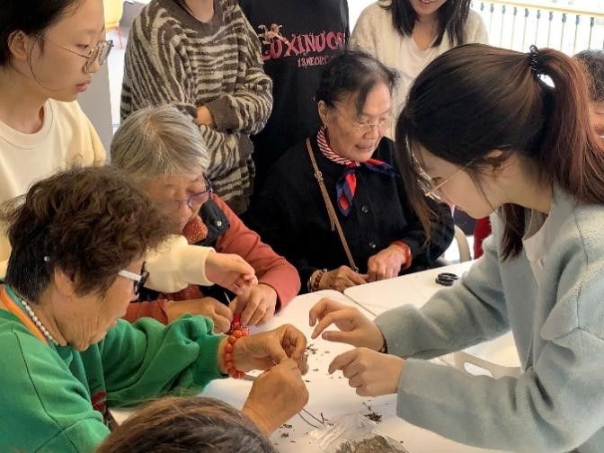 课堂上,志愿者向老人们介绍了香包这一非遗技艺的起源与历史,团队成员耐心指导老人们每一个步骤,从选料、剪裁到缝制,并陪伴老人们完成作品。过程中,大家分享着自己的经验与创意,现场充满了欢声笑语,手作的乐趣让每个人都沉浸其中。